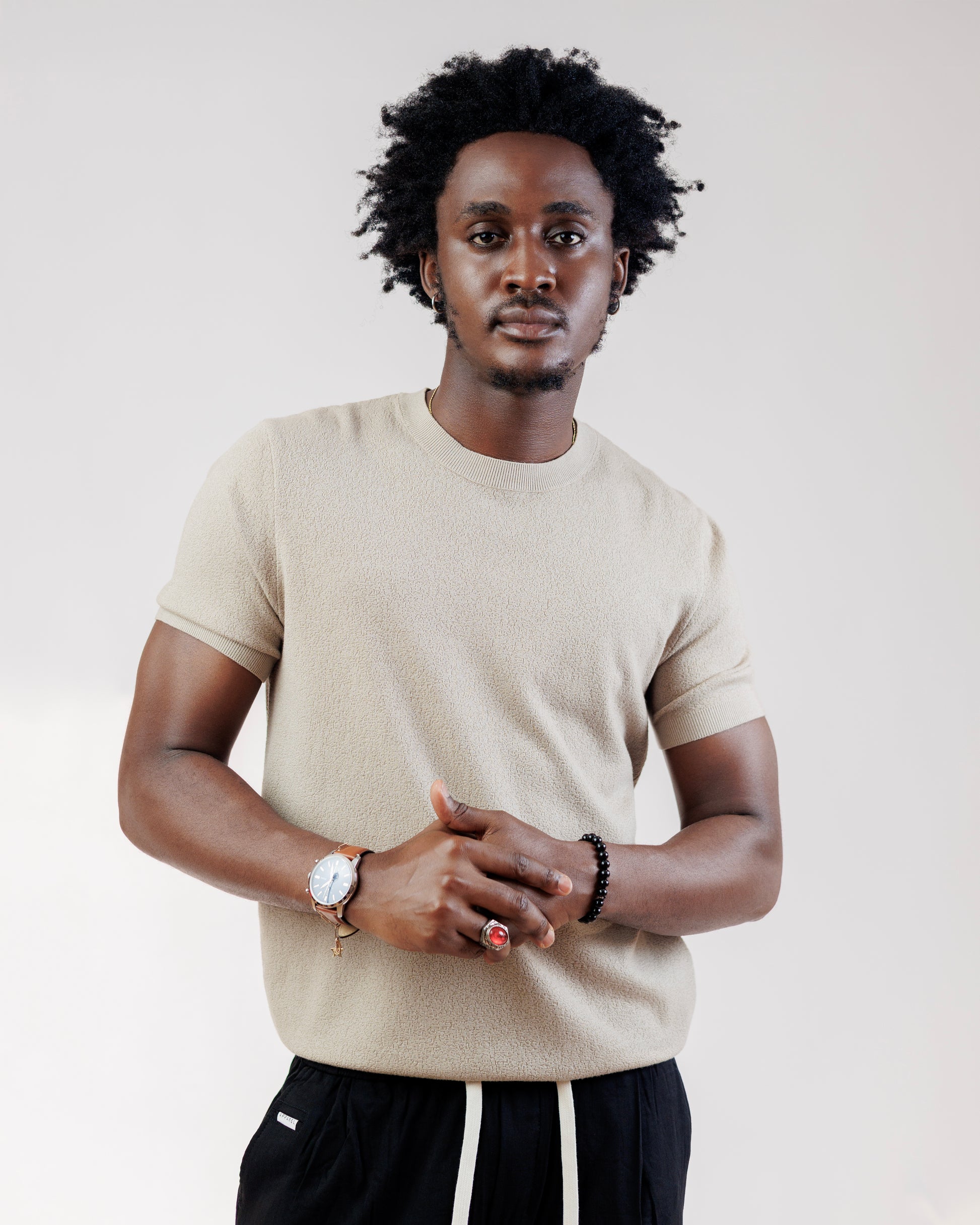 A soft, muted-finish tee with a clean matte surface and a subtle textured feel. Designed for men who prefer understated quality, it drapes effortlessly and pairs with anything — from tailored trousers to weekend denim.